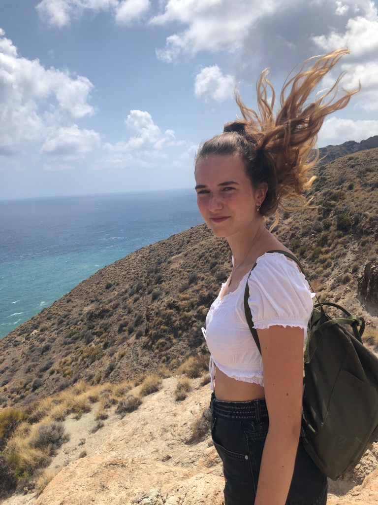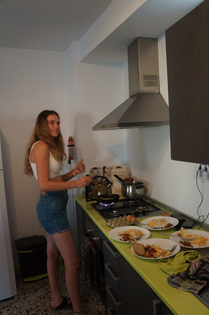 Océanne mange sa sandwich et une petite coquerelle marche au dessus d’elle dans le coins du plafond. Un chat, avec une maladie de peau sous la tête, passe entre les jambes du gars à côté.