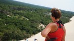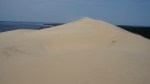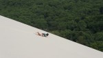 Tout est prêt, et on monte sur le dessus de la dune avec beaucoup d’appréhension. Est-ce que ça va marcher?… absolument pas! La première difficulté est de mettre cette chose au sol; une feuille de 1m carrée au vent, ça s’appelle un cerf volant! Il vente beaucoup et on se fait d’ailleurs exfolier la face sans frais à grands coups de sable de dune. Patrick craint de perdre son meilleurs bronzage à vie dans la minute si on ne descend pas rapidement.