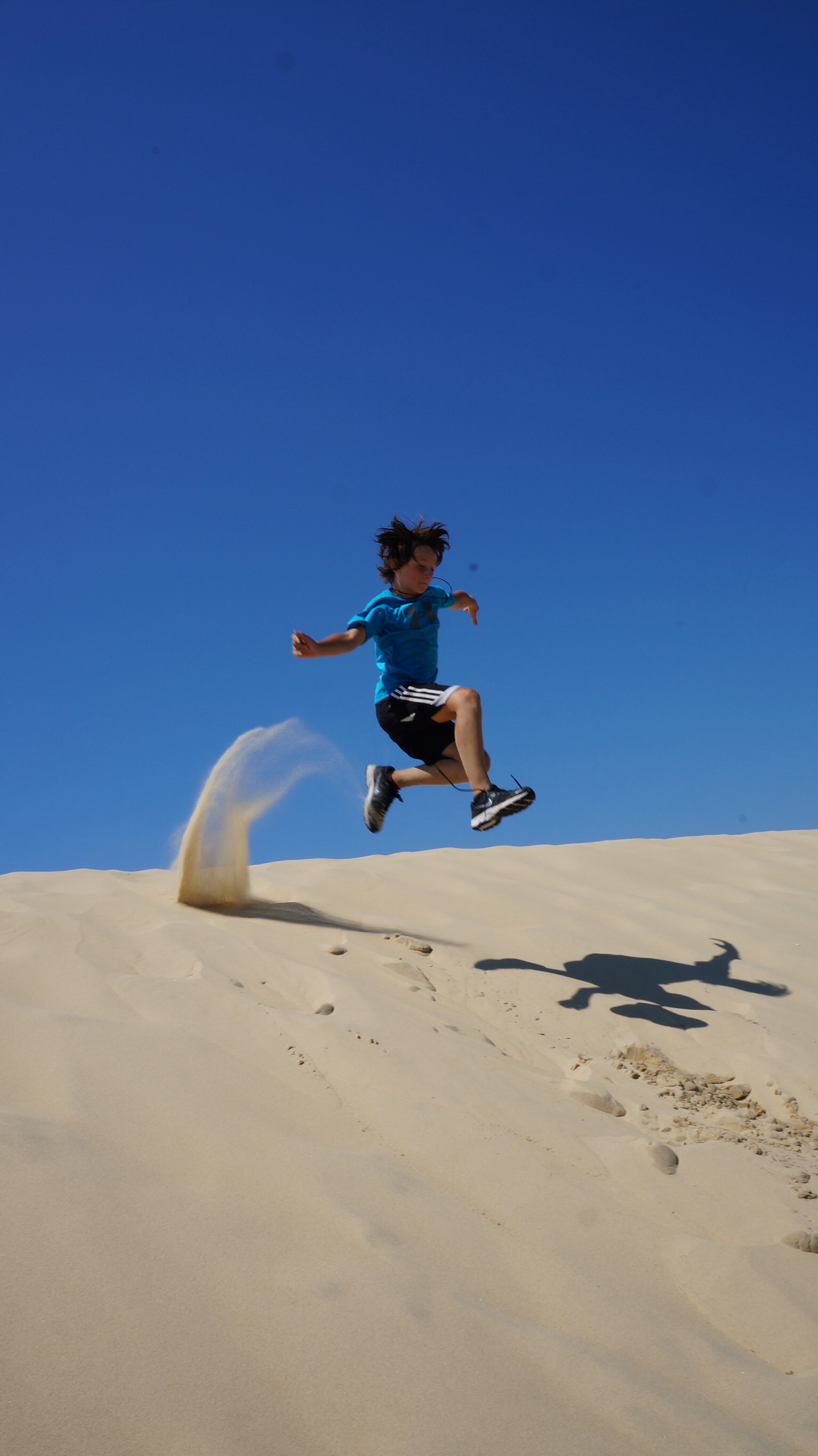 On reste dans les parages pour continuer de profiter de l’extraordinaire endroit. Ce qu’on voudrait faire par dessus aujourd’hui, c’est de se confectionner des « crazy carpets » pour descendre la dune. Il faut dire qu’on vient d’essayer de descendre avec nos matelas de sol et l’expérience est complètement désastreuse… Ça marche pas.