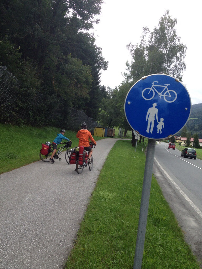 On roule une cinquantaine de kilomètres sur les piste tortueuse suivant la rivière qui nous amène de Spital à Villach. Inévitablement, si vous regardez une carte, elle vous indiquera toujours une distance plus courte que celle qu’on fini par faire. Par exemple aujourd’hui, si vous êtes en voiture, 39 kilomètres auraient suffit, mais pour nous, ce sera plus de 50.